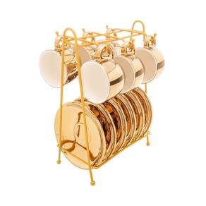 O suporte dourado oferece uma maneira sofisticada de armazenar e exibir as xícaras e pires, adicionando um toque de charme à sua mesa.