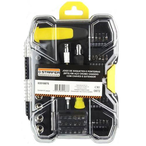 Jogo com 61 peças intercambiáveis de soquetes e pontas (bits)em aço cromo vanádio com encaixes de 1/4? (6,3mm) e 1/8? (3,18mm),chave de precisão, chave reversível com catraca e extensor flexível. Composição do jogo:6 pontas fenda e philips fd1.5, fd2, fd2.5, fd3, fd4, ph000 com encaixe 1/8" (3,18mm);6 pontas philips e torx ph00, ph0, ph1, t5, t6, t8 com encaixe 1/8" (3,18mm);6 pontas estrela e tipo "u" pe0.8, pe1.2, pe2, u2, u2.6, u3 com encaixe 1/8" (3,18mm);6 pontas torx e sextavada t10, t15, h0.7, h1.5, h2, h4 com encaixe 1/8" (3,18mm);6 pontas pozidrive e tipo "y" pz0, pz1, y2, y2.3, y2.5, y3 com encaixe 1/8" (3,18mm);6 pontas philips e pozidrive ph0, ph1, ph2, ph3, pz1, pz2 com encaixe 1/4" (6,3mm);6 pontas torx, pozidrive e adaptador para soquete t10, t15, t20, t25, pz3, ad com encaixe 1/4" (6,3mm);6 pontas fenda e quadrada fd3, fd4, fd5, fd6, s2, s3 com encaixe 1/4" (6,3mm);1 extensor flexível com 11cm (110mm) de comprimento e encaixe 1/8" (3,18mm);1 chave de precisao com 11cm (110mm) de comprimento e encaixe 1/8" (3,18mm);1 chave tipo t com catraca reversível com 16cm (160mm) de comprimento e encaixe 1/4" (6,3mm);9 soquetes 4mm, 5mm, 6mm, 7mm, 8mm, 9mm, 10mm, 11mm, 12mm com encaixe 1/4" (6,3mm);1 estojo plástico.Indicado para apertar e soltar porcas e parafusos sextavados, octagonais, de fenda e phillips.Embalagem: caixa de plástico. Material: Aço cromo vanádioRef. 03510875Marca: Starfer