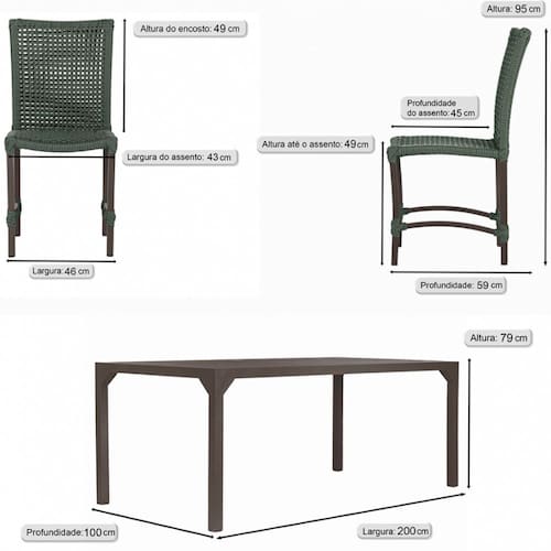 Jogo 8 Cadeiras Cannes Corda Náutica e Mesa Retangular Ripada 2,00m em Alumínio para Edícula, Jardim, Área, Varanda, Cozinha - Pintura Marrom - Azul Marinho