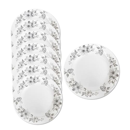 Jogo 8 Prato de Sobremesa Vidro Branco Flores Cinza Flowers Grey 20cm Em Casa Tem