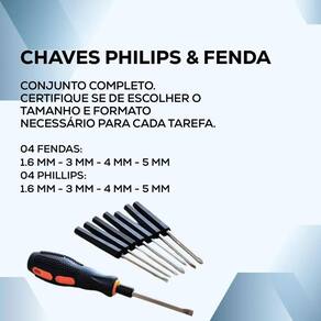 Conteúdo da embalagem: -04 chaves de fenda ponta chata magnética; -04 chave de fenda ponta cruzada magnética; -01 cabo para fixação das chaves; -01 estojo para armazenamento das ferramentas. Marca: Não Informado