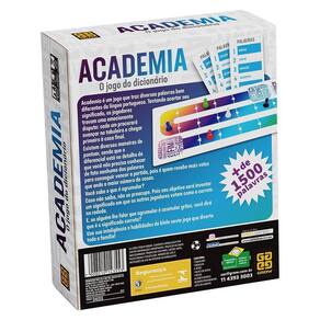 Academia é um jogo que traz diversas palavras bem diferentes da língua portuguesa. Tentando acertar seu significado, os jogadores travam uma emocionante disputa: cada um procurará avançar no tabuleiro e chegar primeiro à casa final.Existem diversas maneiras de pontuar, sendo que o diferencial está no detalhe de que você não precisa conhecer de fato nenhuma das palavras para conseguir vencer a partida, pois é quem recebe mais votos que anda o maior número de casas.Você sabe o que é um agrumularCaso não saiba, não se preocupe. Pois seu objetivo será inventar um significado em que os outros jogadores votem como o correto na rodadaHomologação Inmetro: CE-BRI/ICEPEX-N 01264-25-14