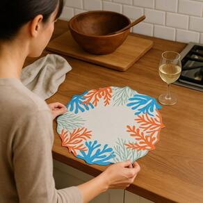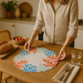 O Jogo Americano Auguri Casa Coralli é a escolha perfeita para quem deseja unir elegância e um toque de frescor marinho à mesa posta. Com formato redondo, ele é confeccionado em tecido branco de alta qualidade e decorado com bordados delicados em tons de coral, azul e verde, formando um padrão inspirado nos recifes do fundo do mar. Ideal para compor mesas sofisticadas e cheias de personalidade, ele valoriza qualquer ocasião – de almoços leves a jantares especiais. Um item charmoso, funcional e cheio de estilo para sua casa.
