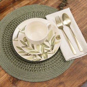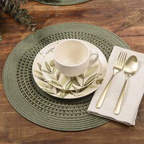 Jogo Americano Copa E Cia Avulso Luna Tressê Olive Jogo Americano Copa e Cia Avulso Luna Tressê Olive - Peça avulsa Características Gerais do Produto: - Composição: 75% Polipropileno (Plástico) e 25 % Poliéster. - Detalhes: Flexível.; Peça Vendida de Forma Avulsa (Individual).; São práticas e versáteis - Cuidados: Evitar contato com objetos cortantes ou superaquecidos.; Não amassar; Não torcer ou dobrar totalmente o produto.; Não utilizar solventes, abrasivos ou alvejantes.; Limpar manualmente com pano úmido e detergente neutro. - Dimensões (cm): Diâmetro: 38 cm Acompanha o produto: - 1 Peça de Jogo Americano Garantia: - Sem Garantia