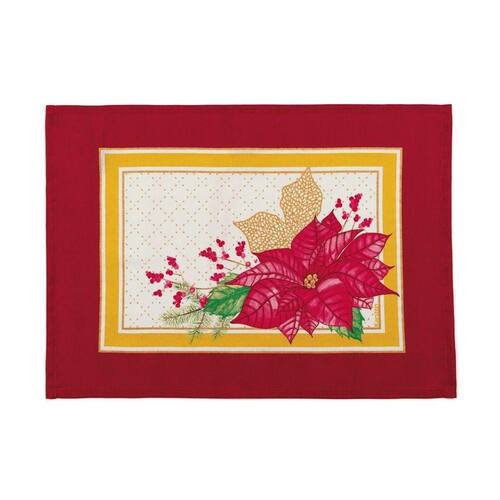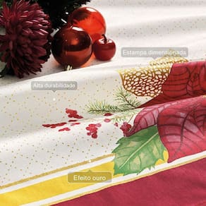 O Jogo Americano de Natal Karsten Poinsétias possui desenho dimensionado com efeito ouro, seu centro é claro e com detalhes delicados, possui barra vermelha e em suas laterais lindas poinsétias.