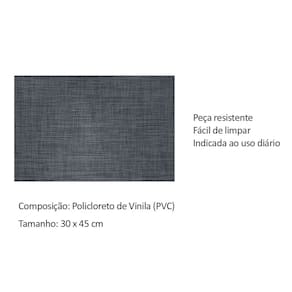 Contem: Lugar Americano - 4 peças Medidas: 30 x 45 cm Composiçao: 100% Policloreto de Vinila (PVC)