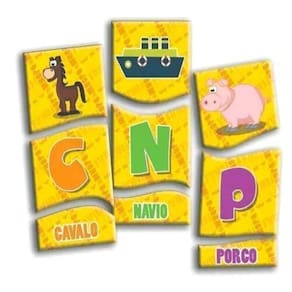 Jogo que desenvolve e estimula o aprendizado do alfabeto. Junte a figura, a letra e o nome da figura. Jogo colorido e ilustrativo, a criança aprende brincando