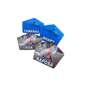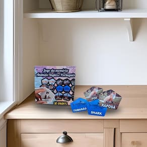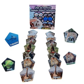 O jogo é composto por 10 pares de peças. Cada par traz o mesmo animal ilustrado, mas em uma peça aparece o nome em português e na outra em inglês. Assim, a criança associa a imagem ao nome nos dois idiomas, ampliando o vocabulário de maneira prática e divertida.
