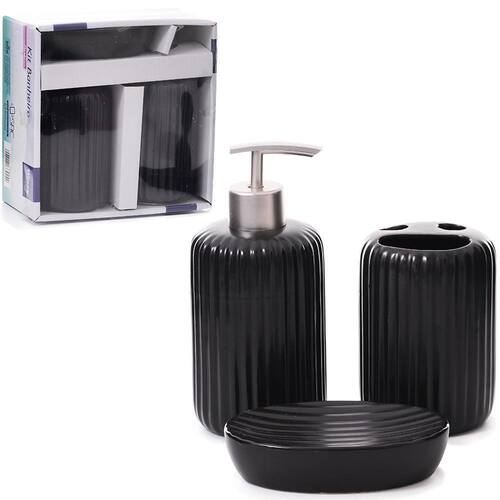 Jogo Banheiro De Porcelana Paski Preto Com 3 Pecas Na CaixaInformações adicionais:Ean: 7908281339242Capacidade: 390mlTamanho aproximado:Saboneteira - 12,2x8x3cmPorta escovas - 11,5x7,7cm de Porta sabonete liquido - 16,7x7,7cm de Tamanho aproximado da caixa: a:16,5xl:18cmPeso aproximado: 790gTipo de produto: jogo para banheiro paski com 3 pecas na caixaCor: pretoComposição: porcelana e plástico