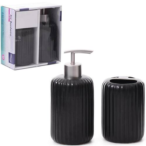 Jogo Banheiro De Porcelana Relevo Paski Preto Com 2 PecasInformações adicionais:Validade: indeterminadaCapacidade: 390mlTamanho aproximado:Porta escovas - 11,5x7,7cm de Porta sabonete liquido - 16,7x7,7cm de Tamanho aproximado da caixa: a:18xl:16,5cmPeso aproximado: 625gTipo de produto: jogo para banheiro paski com 2 pecas na caixaCor: pretoComposição: porcelana e plástico