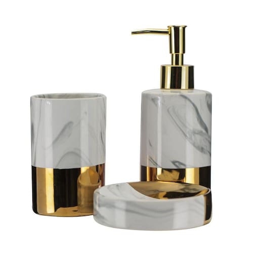 Eleve o estilo do seu banheiro com o nosso Jogo de Banheiro Porcelana Marmorizado Marble Branco com cinza e Dourado cromado de 3 Peças, completo com porta sabonete líquido, porta sabonete em barra e porta escova de dente!