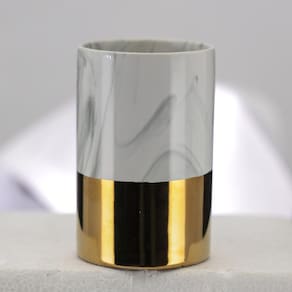 Dê um toque de elegância e sofisticação ao seu banheiro com essa coleção exclusiva de porcelana marmorizada. Combinando a pureza do branco com detalhes dourados, essas peças trarão um charme refinado ao seu espaço de cuidados pessoais.