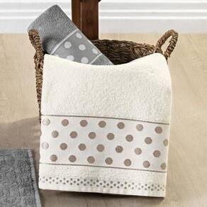 Jogo de Banho Meggy Poá Bolinhas Toalhas Macias 100% Algodão 5 Peças - Cinza Granito e Pérola Descubra o toque macio e o design elegante do Jogo de Banho Meggy Poá. Composto por 5 peças essenciais - 2 Toalhas de Banho, 2 Toalhas de Rosto e 1 Piso, este conjunto foi pensado para elevar a sua experiência diária de autocuidado, proporcionando conforto e sofisticação.