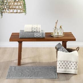 Jogo de Banho Meggy Poá Bolinhas Toalhas Macias 100% Algodão 5 Peças - Cinza Granito e Pérola Descubra o toque macio e o design elegante do Jogo de Banho Meggy Poá. Composto por 5 peças essenciais - 2 Toalhas de Banho, 2 Toalhas de Rosto e 1 Piso, este conjunto foi pensado para elevar a sua experiência diária de autocuidado, proporcionando conforto e sofisticação.