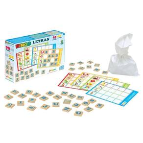 Bingo Letras da Junges com 90 peças em madeira de reflorestamento (MDF) 6mm, tamanho de 3x3cm impressas em serigrafia. Acompanha 4 cartelas cartonadas coloridas e instruções/regras do jogo na embalagem.