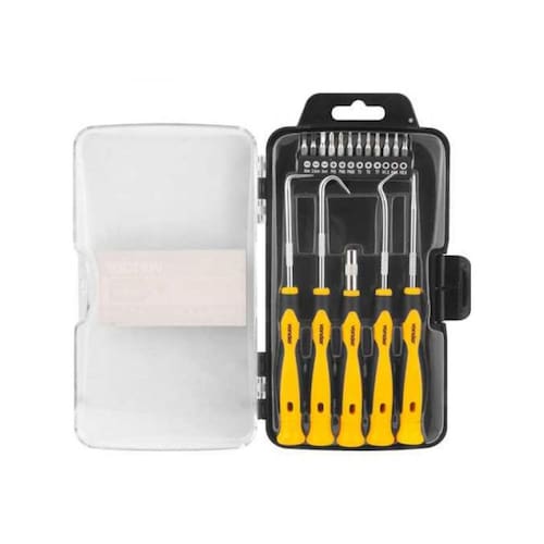 Indicado para Fixar e Soltar Porcas e Parafusos em Geral, Retirar Anéis de Borracha e Minifusíveis Produzido em Aço Cromo Vanádio de Alta Resistência e Durabilidade Tipo de Encaixe dos Bits: Sextavado 1/4'' 6,35 mm Comprimento Total dos Bits: 25 mm Jogo com 17 Peças 1 Estojo Plástico 1 Ponta Reta 1 Ponta Curva 1 Ponta L 1 Ponta 45 1 Cabo Adaptador para Bits 3 Bits Phillips PH000, PH00 e PH0 3 Bits Fenda 2 mm 2,5 mm 3 mm 3 Bits Hexalobular T5 T6 T7 3 Bits Allen 1,3 mm 1,5 mm 2 mm