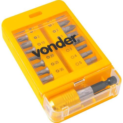 Jogo Bits/Ponteiras Com 15 Pçs Encaixe Sextavado 1/4 - Vonder Atenção: caro cliente, antes de perguntar, verifique a descrição do anúncio. Nele estão todos os detalhes técnicos sobre o produto à venda. Caso ainda tenha quaisquer outras dúvidas, informamos que o horário de atendimento da empresa é de segunda a sexta feira das 8h às 12h e das 13:15h às 18h, com até 1h para as respostas. Conteúdo da embalagem: 1 jogo de bits/ponteiras, composto por um estojo plástico com 15 peças, sendo: 2 bits/ponteiras fenda simples 5 mm e 6 mm , 2 bits/ponteiras fenda cruzada/phillips ph1 e ph2 , 2 bits/ponteiras pozidrive pz1 e pz2 , 3 bits/ponteiras allen 3 mm, 4 mm e 5 mm , 5 bits/ponteiras hexalobular sem furo guia t10, t15, t20, t25 e t30 e 1 adaptador encaixe 1/4 6,35 mm de 60 mm com engate rápido. Indicado para fixar e soltar parafusos em geral. Utilizado em parafusadeiras e suportes manuais. Possui acabamento fosfatizado que aumenta a proteção contra oxidação/corrosão e conta com adaptador com engate rápido. Produzido em aço cromo vanádio, proporcionando maior resistência e durabilidade. Detalhes técnicos Material do bits/ponteira: aço cromo vanádio Acabamento do bits: fosfatizado Tipo do encaixe do bits: sextavado - 1/4 6,35 mm Comprimento total do bits/ponteira: 25 mm - e cdc : legal de 90 dias Marca: Não Informado Ean: 7893946627522