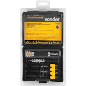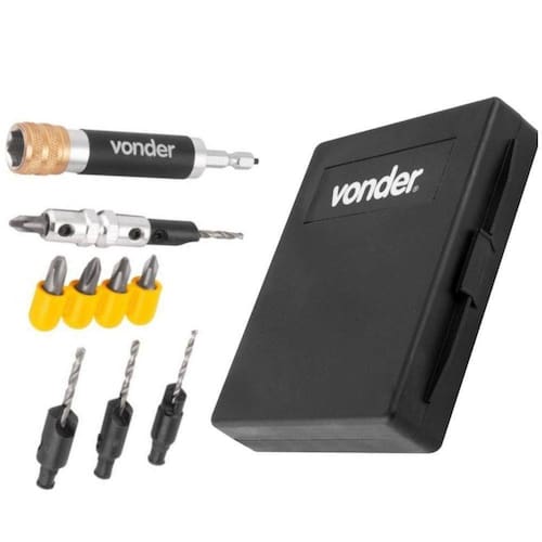 Jogo Bits/Ponteira Escariadores com 11 peças Enc 1/4 - Vonder Conteúdo da Embalagem: 1 Jogo de bits/ponteiras e brocas escariadoras, composto por 1 estojo plástico com 11 peças, sendo: 5 bits de 25 mm (1 - PH1, 3 - PH2 e 1 - PH3), 4 brocas escariadoras, sendo: 1 escariador N 6 (8 mm) com broca de 3/32, 1 escariador N 8 (9,5 mm) com broca de 7/64, 1 escariador N 10 (9,5 mm) com broca de 1/8, 1 escariador N 12 (11 mm) com broca de 1/8, 1 conector multifunção e 1 haste de alumínio com encaixe sextavado Descrição: Jogo de bits/ponteiras e brocas escariadoras, 11 peças, encaixe de 1/4, VONDER Aplicações e dicas de uso: Indicado para parafusadeiras e furadeiras. Realiza trabalhos de pré-furo, parafusar e desparafusar, além de trabalhos de escarear. Destaques e diferenciais: Acompanha estojo para a organização, manuseio e transporte com segurança de todo o jogo Características Técnicas: Quantidade de peças: 11 peças Atenção: As compras realizadas em nome de Pessoa Jurídica estão sujeitas à cobrança de ICMS, conforme Protocolo ICMS 41, de 4 de Abril de 2008. Caso você tenha dúvidas sobre o percentual a ser aplicado, consulte a Cláusula Segunda, §1° do referido Protocolo.