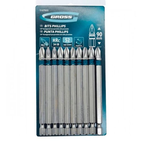 Descrição do Produto: • O Jogo de Pontas Phillips PH2 90mm 10 Peças 1137955 Gross é ideal para você ter as ponteiras corretas. O jogo conta com 10 ponteiras de aço da Gross Phillips número 2 (1/4 Pol) de 90mm. Indicado para parafusadeiras elétricas e manuais.