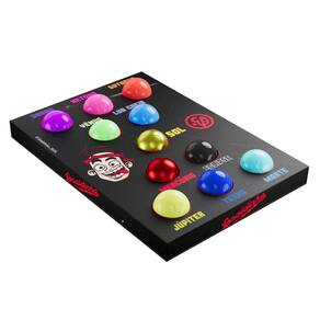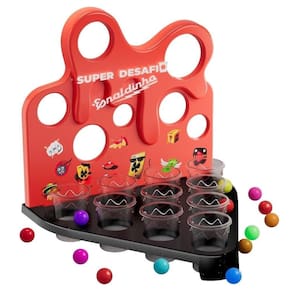 CONTÉM: 01 Tabuleiro com Alvo 01 Cartela de Adesivos 01 Display para Bolinhas 06 Potes de Gelástica 11 Bolinhas Colecionáveis.