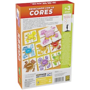 Linha Brincando & Aprendendo GrowAuxilia na identificação e no reconhecimento das cores.Brincando com as cores traz 8 das principais cores para a criança identificar, separar e encaixar as figuras correspondentes. Essa atividade estimula o reconhecimento e a identificação, e ajuda a memorizar as cores e seus nomes.A partir de 3 anosParticipantes: 1 ou maisContém: 8 cartelas com 5 imagens cada Ean: 7908010143690