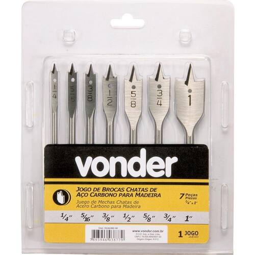 Conteúdo da embalagem 1 Jogo de brocas chatas com 7 peças, sendo: 1/4" - 5/16" - 3/8" - 1/2" - 5/8" - 3/4" e 1" Aplicações e dicas de uso Indicado para chapas finas de madeira e derivados Destaques e diferenciais Possui ponta com afiações especiais, que facilitam a centralização do furo. Estojo plástico que facilita a acomodação, organização.