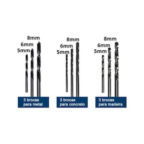 Jogo Broca Para Madeira / Concreto / Metal 9 Pecas 5/6/8mm Jogo Broca Para Madeira / Concreto / Metal 9 Pecas 5/6/8mm ===================================== A escolha ideal para quem precisa de precisão, durabilidade e versatilidade em suas tarefas de perfuração.