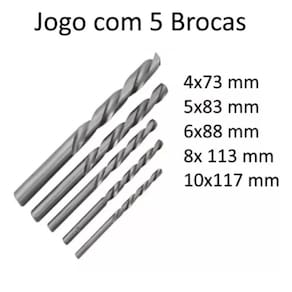 Jogo brocas para aço - perfuração com alta resistência Jogo com 5 brocas: - 5 brocas de aço rápido Descrição do produto: Brocas de aço rápido: - medidas das brocas: 4, 5, 6, 8 e 10 mm. - brocas com pontas resistentes para mais rapidez no furo com menos esforço. O kit de brocas é muito adequado para a utilização para furos em uma variedade de materiais, incluindo metal, madeira plastico aluminio, etc. Marca: Não Informado Ean: 7895688656358