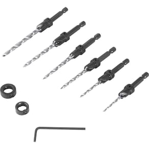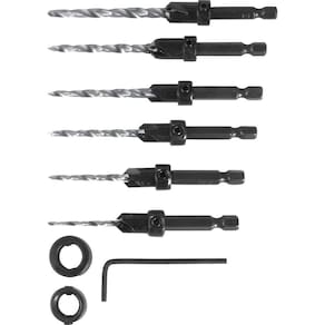 1 Jogo de brocas com escariador, composto por 8 peças, sendo: 6 brocas escareadoras (1 escariador de 4 mm com broca de 7/64 (2,8 mm), 1 escariador de 6 mm com broca de 9/64 (3,6 mm), 1 escariador de 8 mm com broca de 11/64 (4,4 mm)), 1 escariador de 10 mm com broca de 3/16 (4,8 mm), 1 escariador de 12 mm com broca de 7/32 (5,6 mm) e 1 escareador de 14 mm com broca de 1/4 (6,4 mm) e 2 batentes/limitadores ajustáveis de profundidade