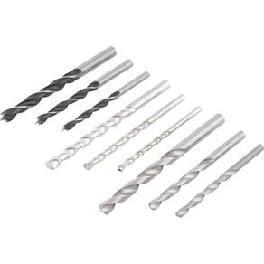 1 Jogo de brocas com 9 peças, sendo: 3 brocas de aço rápido: 5,0 mm - 6,0 mm e 8,0 mm | 3 brocas com 3 pontas para madeira: 5,0 mm - 6,0 mm e 8,0 mm | e 3 brocas com ponta de metal duro/vídea: 5,0 mm - 6,0 mm e 8,0 mm