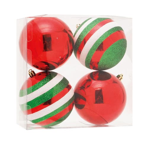bola listras vrm/vdc/bco 10cm () jg c/4 pc - Cor Predominante: VERMELHO - Materia Prima: 100% Plástico - Instruções de Limpeza: Limpar apenas com pano macio e seco - Destaques: Recrie a magia do Natal com sua decoração nesta temporada, essas bolas são perfeitas para pendurar na árvore ou dar um toque especial em sua guirlanda. Exiba suas decorações de árvore de Natal com estilo com essas bolas.