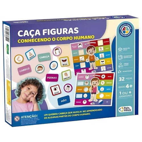 Jogo Caça Figuras - Corpo Humano - Pais E Filhos Apresentamos o Jogo Casa Figuras, um brinquedo educativo que promete transformar o aprendizado em uma experiência fascinante e divertida para as crianças! Este jogo é perfeito para auxiliar no desenvolvimento da coordenação motora fina, no reconhecimento de formas e cores, e também serve como uma introdução às partes do corpo humano. Com regras simples e interativas, o Jogo Casa Figuras inclui diversas peças destacáveis que a criança espalha sobre a mesa e dois tabuleiros temáticos para explorar de formas distintas. Um combo de diversão e aprendizado! Código: 101334 Dimensões aprox. da embalagem em cm: 5x32x25 Peso liq. Aproximado do produto na embalagem: 287g Certificado Inmetro: 003934/2019 Referência do Modelo: 791901-1 Composição/material: Papel Cartão Conteúdo da Embalagem: 32 Peças Idade recomendada: a partir de 4 anos Garantia: 90 dias contra defeitos de fabricação pelo fabricante. Imagens meramente ilustrativas. As cores e tonalidades podem variar. Gênero - Meninas Meninos Unissex Idade - 3 anos 4 anos 5 anos 6 anos 7 anos 8 Anos Coleção - Colecionável Tipo - Estratégia Habilidade Memória Puzzle Raciocínio Lógico Sorte Quantidade de Peças - Acessórios para Puzzle Até 100 Peças