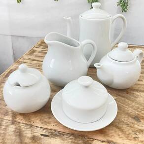 Jogo Café Chá Mesa Posta, Chaleira 500ml + Açucareiro 350ml + Jarra Leiteira 740ml + Manteigueira 150ml + Bule 1L - Kit Porcelana BrancaPeças de porcelana feitas de material de alta qualidade, queimados em alta temperatura, o que os torna fortes, resistentes e com alto brilho, e deixa qualquer ambiente mais bonito e moderno. A porcelana tem uma enorme vantagem sobre outros materiais, pois é fácil de limpar e não absorve cheiro, o que deixa a peça e o ambiente livre de mal cheiro.São resistentes ao forno e micro-ondas e lava louçasCor BrancaCapacidades:Chaleira 500mlAçucareiro 350mlJarra Leiteira 740mlManteigueira- 150ml Bule - 1L Pode haver variação de tonalidade entre as peças devido a diferentes lotes de queima.Embalagem contêm 5 peças Marca: Antilope Decor Porcelanas