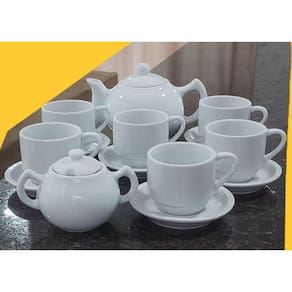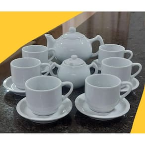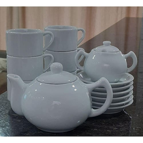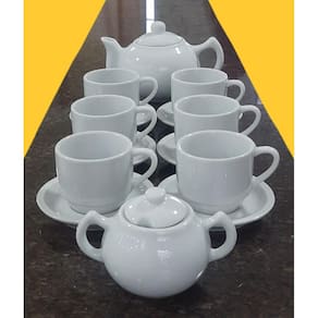 Embalagem contêm 14 peças (1 açucareiro, 1 bule chaleira, 6 xícaras, 6 pires)