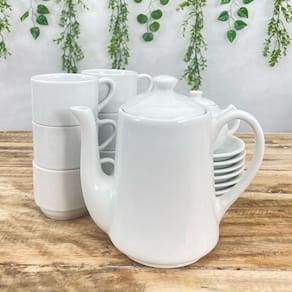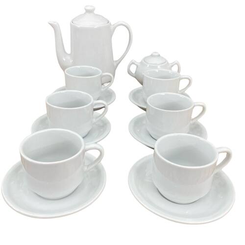 Jogo Café e Chá Mesa Posta 14 peças - Bule 1L + Açucareiro 250ml + 6 xícaras café/chá 200ml empilháveis c/ pires Peças de porcelana feitas de material de alta qualidade, queimados em alta temperatura, o que os torna fortes, resistentes e com alto brilho, e deixa qualquer ambiente mais bonito e moderno.A porcelana tem uma enorme vantagem sobre outros materiais, pois é fácil de limpar e não absorve cheiro, o que deixa a peça e o ambiente livre de mal cheiro.São resistentes ao forno e micro-ondas.Cor BrancaCapacidades:Bule: 1L Açucareiro Chaleira: 250mlXícaras: 200ml São empilháveis, o que torna o armazenamento mais práticoOBS: Pode haver variação de tonalidade entre as peças devido a diferentes lotes de queima.Embalagem contêm 14 peças (1 açucareiro, 1 bule chaleira, 6 xícaras, 6 pires) Marca: Antilope Decor Porcelanas