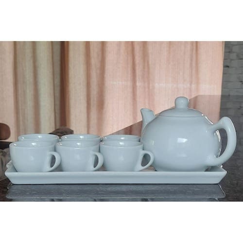 Jogo Café e Chá Mesa Posta, Bandeja + kit 6 xícaras cônicas 100ml + Chaleira 830ml - Porcelana Branca Peças de porcelana feitas de material de alta qualidade, queimados em alta temperatura, o que os torna fortes, resistentes e com alto brilho, e deixa qualquer ambiente mais bonito e moderno. A porcelana tem uma enorme vantagem sobre outros materiais, pois é fácil de limpar e não absorve cheiro, o que deixa a peça e o ambiente livre de mal cheiro. São resistentes ao forno e micro-ondas. Cor Branca Capacidades: Bule chaleira japonesa 830ml Xícaras Cônicas 100ml Bandeja (CxLxA) 36cm x 18,5cm x 2,5cm OBS: Pode haver variação de tonalidade entre as peças devido a diferentes lotes de queima. Embalagem contêm 8 peças Marca: Antilope Decor Porcelanas