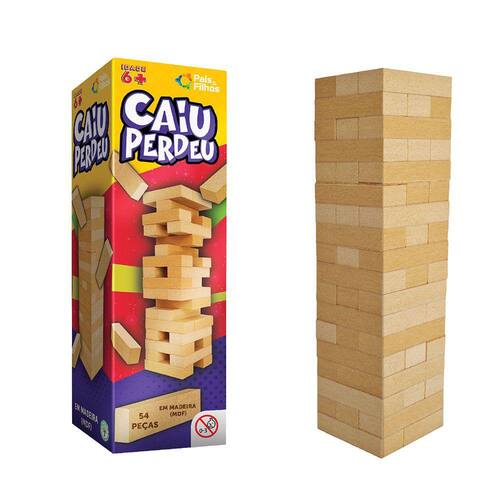 O Jogo Caiu Perdeu Pais e Filhos é uma ótima pedida para a diversão em família. Jogo clássico de habilidade física e mental, os jogadores se revezam para remover blocos de uma torre, equilibrando-os no topo, criando uma estrutura cada vez maior e mais instável à medida que o jogo progride. São 45 blocos de madeira que são empilhados em uma torre e em cada rodada um jogador deve retirar um bloco de qualquer andar. O bloco retirado deve ser posto no topo da torre, de modo que os blocos formem novos andares. Ganha quem remover a última peça sem derrubar a torre.