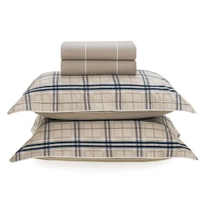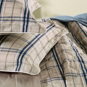 Uma cama jovem para um quarto moderno. O Jogo de Cama Karsten Hector, possui padronagem xadrez de base marrom com uma mesclagem de linhas azuis, brancas e beges nas fronhas de 50cm x 70cm e base marrom com linhas horizontais brancas no lençol de elástico de 1,38m x 1,88m x 35cm e no sobre lençol de 2,20m x 2,50m.
