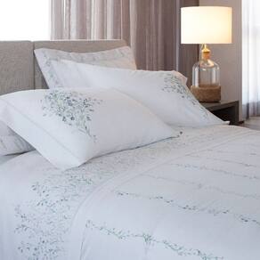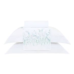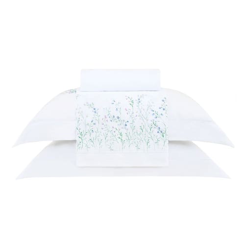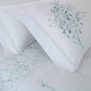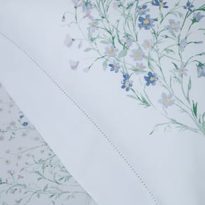 O design encanta à primeira vista: flores campestres aquareladas em tons suaves de azul pastel criam uma atmosfera serena e sofisticada, com inspiração vintage e delicadeza visual. Nas fronhas, o buquê espelhado aliado ao acabamento em ponto ajour traz simetria, charme e um refinamento especial, valorizando a decoração do quarto com elegância.