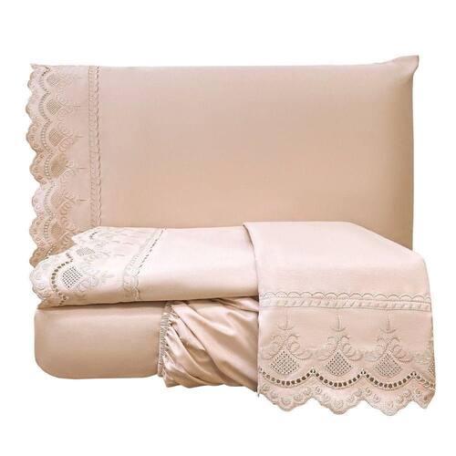 O Jogo de lençol para cama King com 04 peças confeccionado em tecido Micropercal 300 fios, detalhes em bordado inglês na fronha e no lençol de cima. Possui alto padrão de qualidade, proporciona conforto e sofisticação.