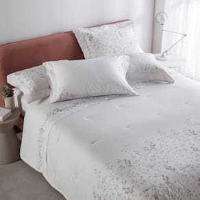 Os delicados florais aquarelados em tons suaves de lilás, aplicados sobre um fundo com textura de mosaicos, criam uma composição charmosa e sofisticada. A vira do sobrelençol e as fronhas ganham ainda mais requinte com os acabamentos em ponto ajour, um detalhe clássico que valoriza a estética da cama e eleva a decoração do quarto.