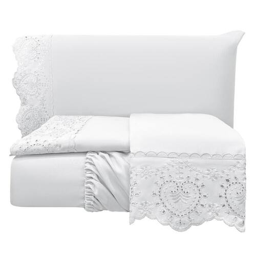Jogo Cama Lençol Detail King Bordado Guipir Bordado Inglês Percal 300 Fios 4 Peças - Branco