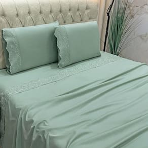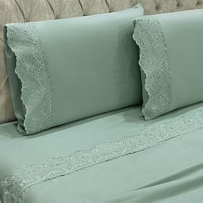Jogo Cama Lençol Detail Queen Bordado Guipir Bordado Inglês Percal 300 Fios 4 Peças - Verde Menta O Jogo de Cama Lençol Detail é a escolha perfeita para quem busca elegância e conforto em cada detalhe. Feito em Percal de Poliéster 300 Fios, traz a suavidade e o toque acolhedor de algodão para noites de sono agradáveis e revigorantes. Seu design sofisticado com bordado inglês adiciona charme ao quarto, elevando a decoração com um toque clássico. Além disso, o lençol de baixo com elástico garante um ajuste perfeito ao colchão, proporcionando praticidade e durabilidade. Transforme seu quarto em um ambiente aconchegante e sofisticado com o Jogo de Cama Detail
