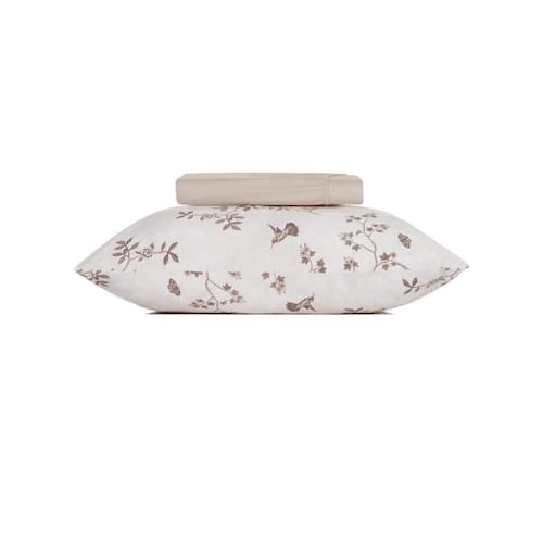A estampa Paradis Composê traz delicadeza e elegância para o quarto com desenhos de pássaros e folhagens em tons sutis sobre o fundo bege mocha. Confeccionada com enchimento em poliéster thermobonder macio e leve, garante conforto e praticidade no dia a dia. Disponível em edredom, jogo de colcha com porta-travesseiros, jogo de cama completo com lençol superior, inferior e fronhas com viés, além da versão simples com lençol de elástico e fronhas envelope. Um toque sofisticado para transformar sua cama em um refúgio de aconchego.