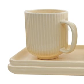 Imagine começar sua manhã com seu café favorito servido em uma caneca de cerâmica de alta qualidade, acompanhada por uma travessa que acomoda perfeitamente seus croissants ou biscoitos. O tom bege vibrante do conjunto adiciona um toque de natureza e frescor à sua mesa, criando uma atmosfera acolhedora e contemporânea em qualquer ambiente.