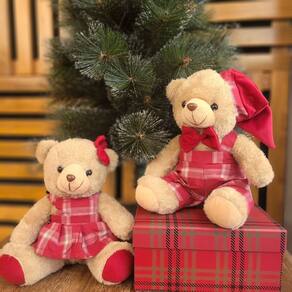 Jogo 2 Ursos de Pelúcia Natalino – Vestido Xadrez, Gorrinho e Lacinho Vermelho 20cm