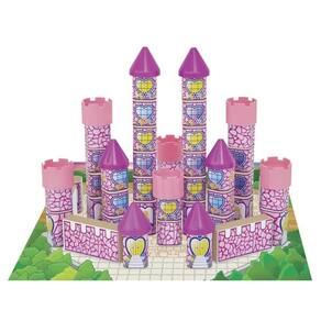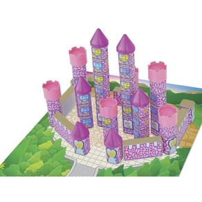 Produzido com bloquinhos de madeira MDF de reflorestamento e peças plásticas para as torres e telhados, o conjunto vem com uma base em papel cartonado e uma cartela de adesivos coloridos para personalizar cada detalhe do castelo.