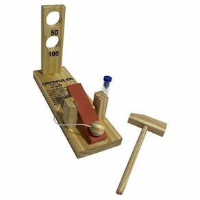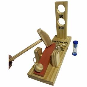 o objetivo do jogo catapulta é marcar o maior número de pontos possíveis dentro de um determinado tempo que é marcado pela ampulheta que acompanha o jogo. Vire a ampulheta para começar a contar o tempo. Coloque a no local indicado e com o martelo bata na alavanca para acertar o alvo