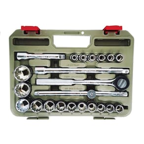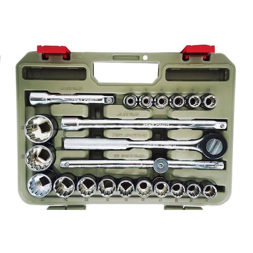 Fabricada em cromo-vanádio é ultra resistente e pode ser usado nos serviços mais pesados como mecânica e indústria com toda segurança, acabamento com polimento permite fácil limpeza das peças. O jogo de catraca e soquete 23 peças é feito com a mais alta tecnologia para uso profissional e domestico.