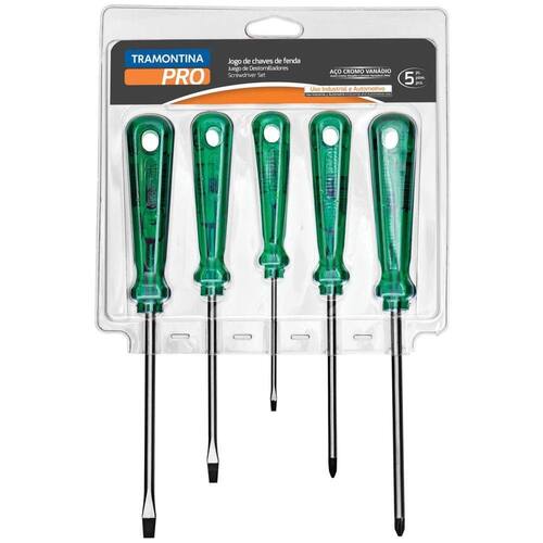 Jogo Chave De Fenda 5 Peças Tramontina Pro Jogo Chave de Fenda 5 Peças Tramontina PRO Seja em manutenções industriais ou automotivas, apertar ou afrouxar parafusos se torna mais fácil com a ajuda das Chaves Easygrip da Tramontina PRO. Seu cabo com formato sextavado proporciona maior conforto e agilidade na utilização. Estão disponíveis com ponta chata, cruzada, trafix, trafix PZ e canhão nos modelos tradicional, toco e com isolação. Escolha o tamanho ideal para o seu trabalho e mãos à obra.